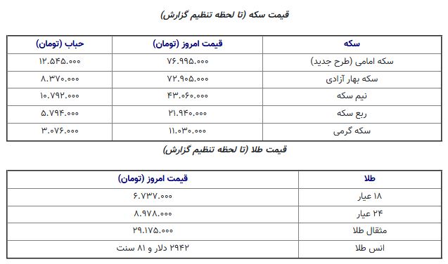 بازار طلای تهران امروز شاهد نوساناتی بود؛ سکه امامی که روز گذشته با قیمت ۷۵ میلیون و ۶۸۰ هزار تومان معامله می‌شد، طی یک ماه اخیر از ۵۶ میلیون به بیش از ۷۷ میلیون تومان رسیده است. در مقابل، هر گرم طلای ۱۸ عیار نیز با اندکی کاهش، به ۶ میلیون و ۷۳۷ هزار تومان قیمت‌گذاری شد.