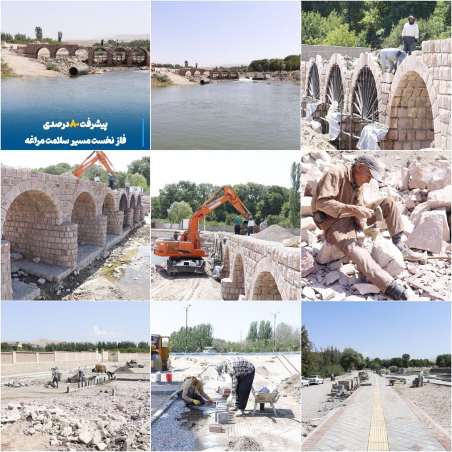 یکی از بخشهای متمایز پروژه مسیر سلامت، احداث پل سنگی طاقی با معماری سنتی است که به طول ۵۰ متر و با ۱۱ دهانه و عرض ۳.۵ متر در دست اجراست. این پل علاوه بر کارکرد ترافیکی، بهعنوان یک المان معماری و هویتی، چهرهای ماندگار به محور رودخانه خواهد داد. طراحی آن با الهام از بافت تاریخی شهر مراغه انجام شده و تاکنون ۶۰ درصد از عملیات اجرایی آن پیش رفته است.