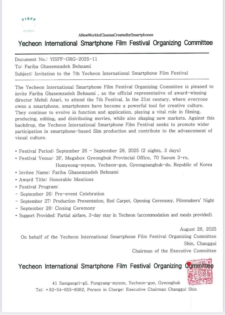 فیلم کوتاه «اجاره داده شد» به کارگردانی و تهیهکنندگی مهدی آذری، با ورود به بخش مسابقه هفتمین دوره جشنواره بینالمللی اسمارتفن یوچن کره جنوبی، یک دستاورد جدید در عرصه سینمای ایران به شمار میرود. این جشنواره معتبر، که بهویژه آثار فیلمبرداریشده با تلفن همراه را مورد توجه قرار میدهد، به یکی از مهمترین و شناختهشدهترین رویدادهای سینمایی کره جنوبی تبدیل شده است. علاوه بر جوایز باارزش و امکانات حمایتی فراوان، این جشنواره در سطح آسیا جایگاهی ویژه دارد و در حال حاضر، در شرق کره جنوبی و در شهر یوچن برگزار میشود.